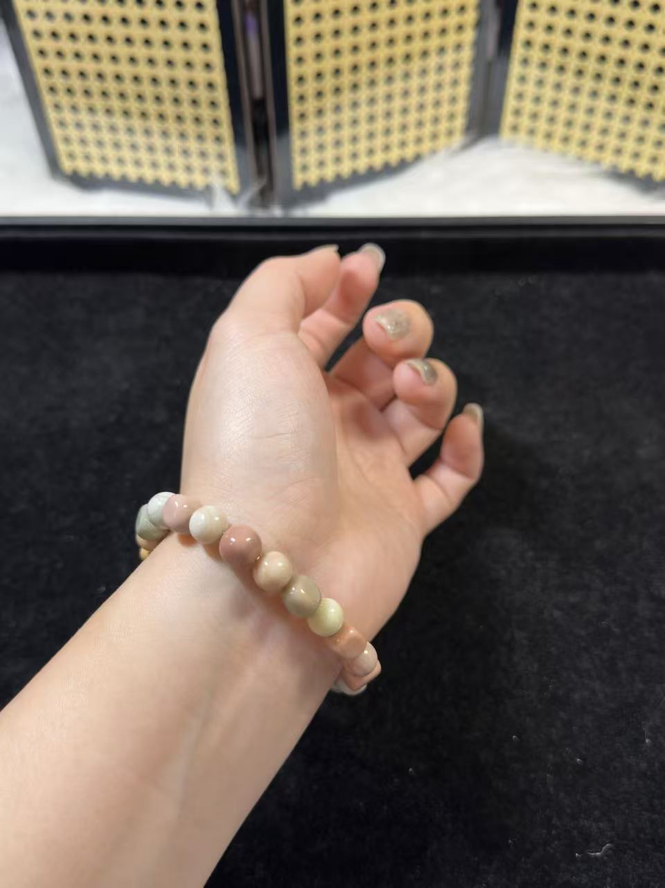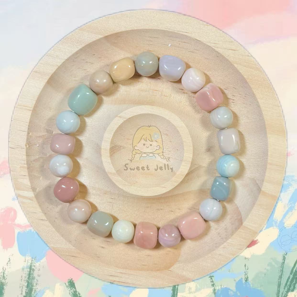 The bracelet is made of natural gemstone which is Alashan Agate. It is Macaron series of Alashan. It is designed with irregular beads. This bracelet has a high saturation! The stone is clean and really minor natural pores on 1 or 2 particles. Since the stone comes from natural material, some small natural pores or maybe tiny cracks is normal. If you cannot accept these minor flaws, please do not place an order.