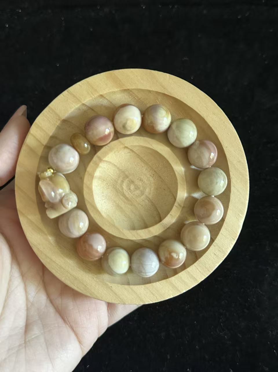 The bracelet is made of natural gemstone which is Alashan Agate. It is belong to Fruity Series of Alashan. For this series, it will be less affect by lighting color than other Alashan Agate.