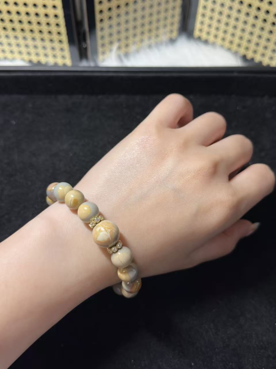 The bracelet is made of natural gemstone which is Alashan Agate. This stone is belong to Dreamy Series of Alashan Agate. This series will be affected a bit from lighting condition, it is extremely pretty under sunlight!