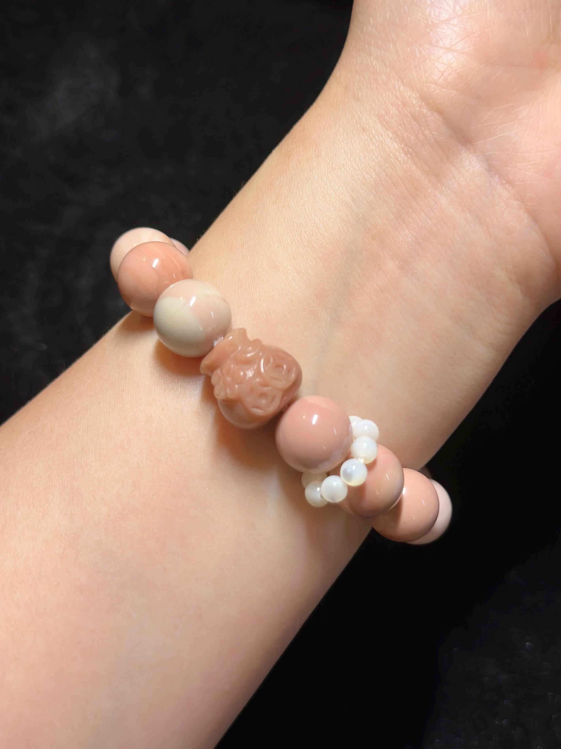 The bracelet is made of natural gemstone which is Alashan Agate. This stone is belong to Dreamy Series of Alashan Agate. It was designed with a lucky money bag and rose charm. I chose all of the light pink color stones for this bracelet. Especially, this pink color is less affected by lighting condition than other Alashan. It is a high-grade stone in Alashan Agate series.