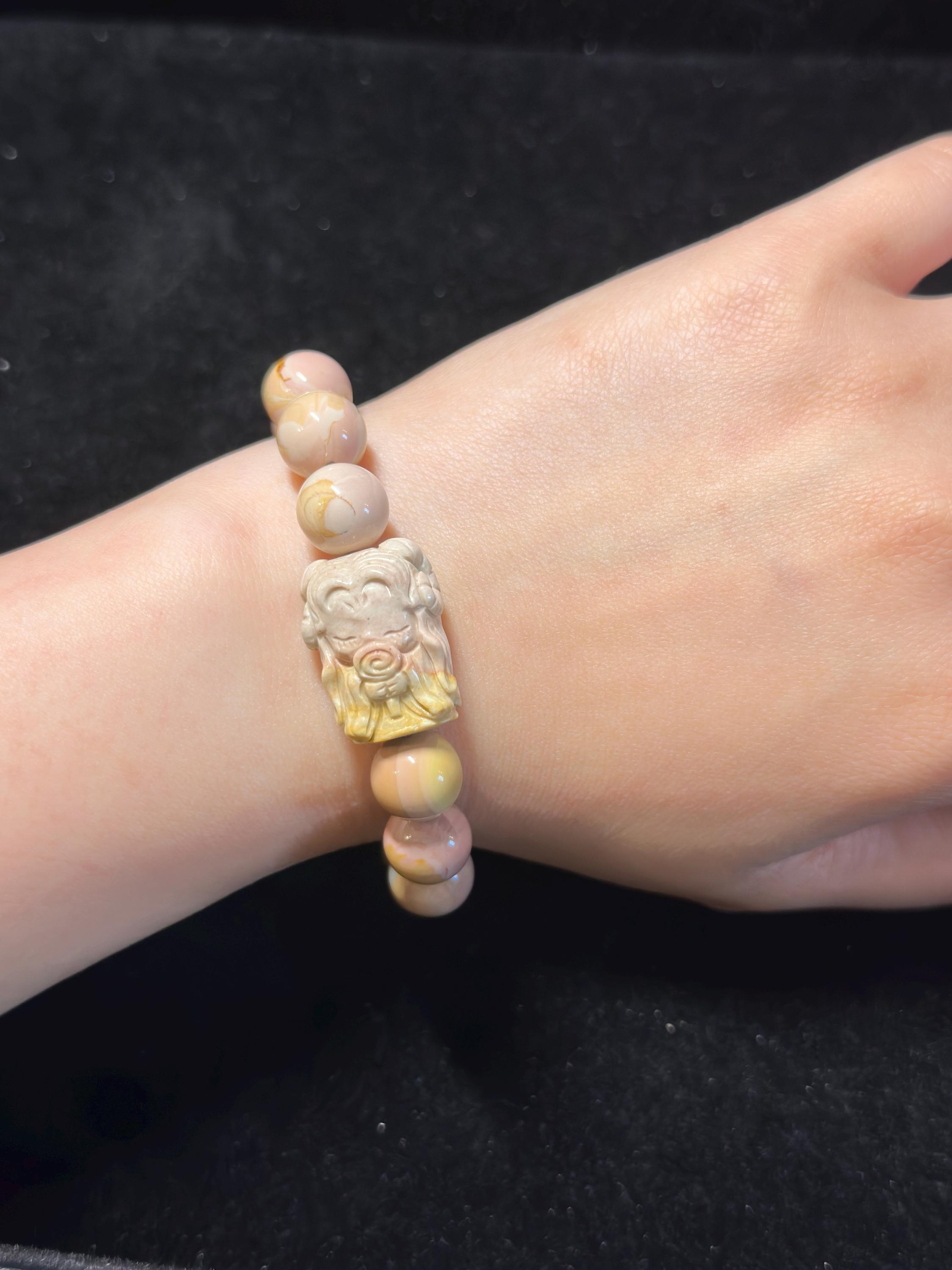 The bracelet is made of natural gemstone which is Alashan Agate. This stone is belong to Dreamy Series of Alashan Agate. This series will be affected a bit from lighting condition.