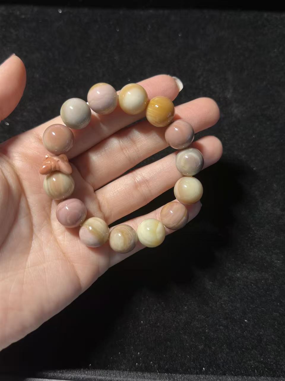 The bracelet is made of natural gemstone which is Alashan Agate. It is belong to Fruity Series of Alashan. The bracelet is designed with cute cat spacer. This is a really cute bracelet!