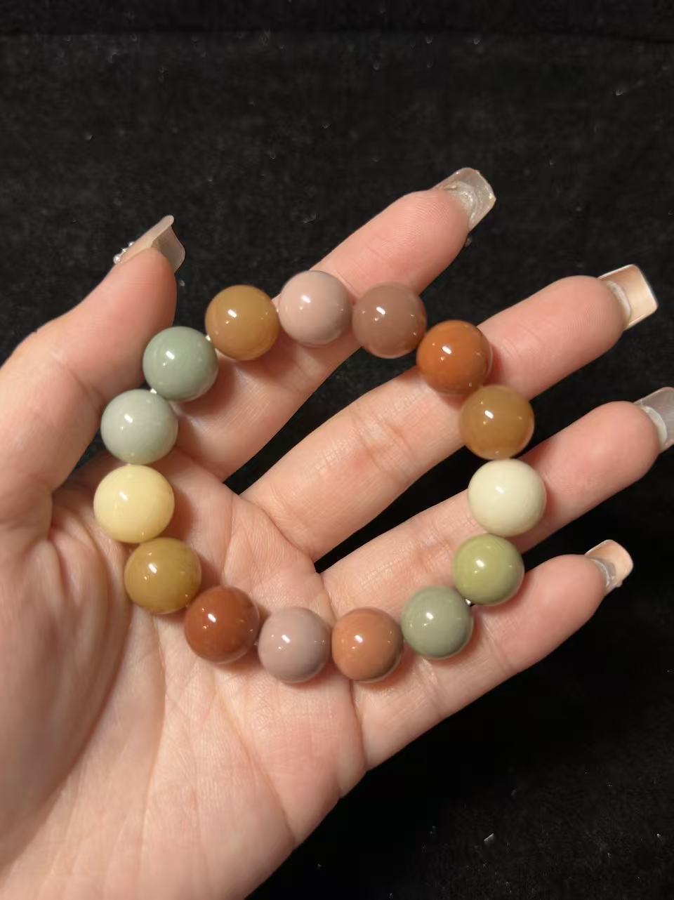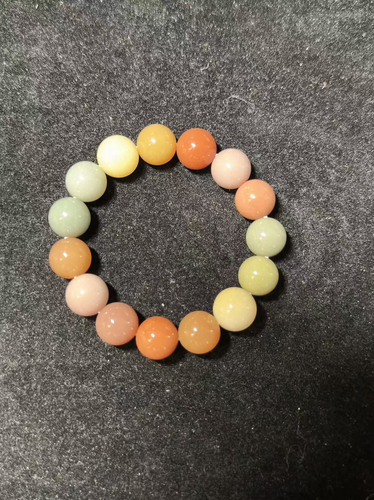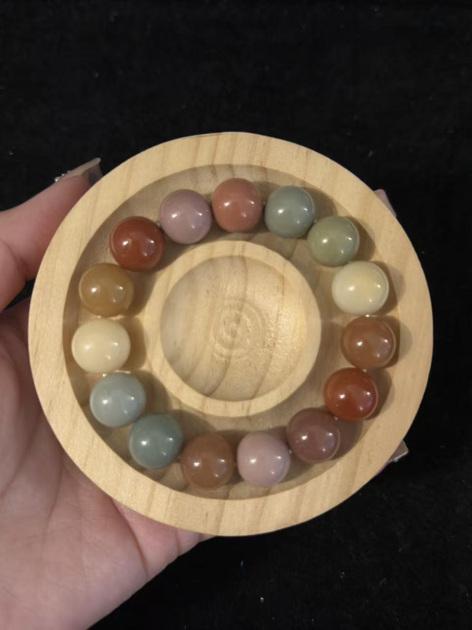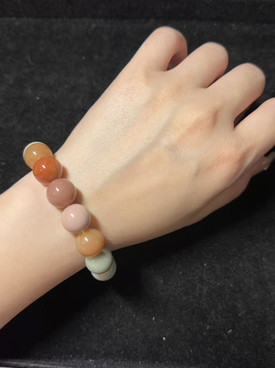 The bracelet is made of natural gemstone which is Alashan Agate. It is Rainbow series of Alashan. The stone is clean and really minor natural pores on 1 or 2 particles. This Alashan series are less affected by lighting condition. It is still colorful both indoor and outdoor. The color will be more beautiful under sunlight.
