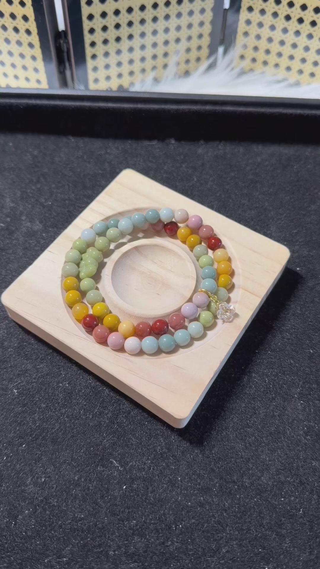 The bracelet is made of natural gemstone which is Alashan Agate. It is Rainbow series of Alashan. The stone is clean and really minor natural pores of 1 or 2 particles. This Alashan series are less affected by lighting condition. It is still colorful both indoor and outdoor. The color will be more beautiful under sunlight.